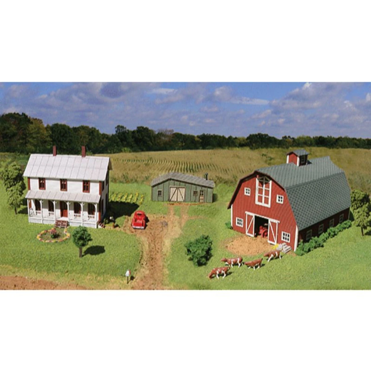This money-saving combo includes four complete N scale kits: the Country Barn, the Two-Story Farmhouse, and two (2) Sonny’s Shacks. Displayed together, they form a typical midwestern family farm scene. All three kit designs feature 100% laser-cut parts and Peel & Stick and Tab & Slot assembly for ease of construction. Assembled, the Country Barn measures 4-1/4 long x 3-1/4 wide x 3-1/4″ high and includes hexagonal shingles, the Two-Story Farmhouse, with its attached rear kitchen and delicately detailed front porch measures 2-1/2″ long x 2-1/2″ wide x 2-1/4″ high, and the Sonny’s Shacks, outfitted with green colored tarpaper, each measure 2-1/2″ long x 1-1/2″ wide x 1″ high.