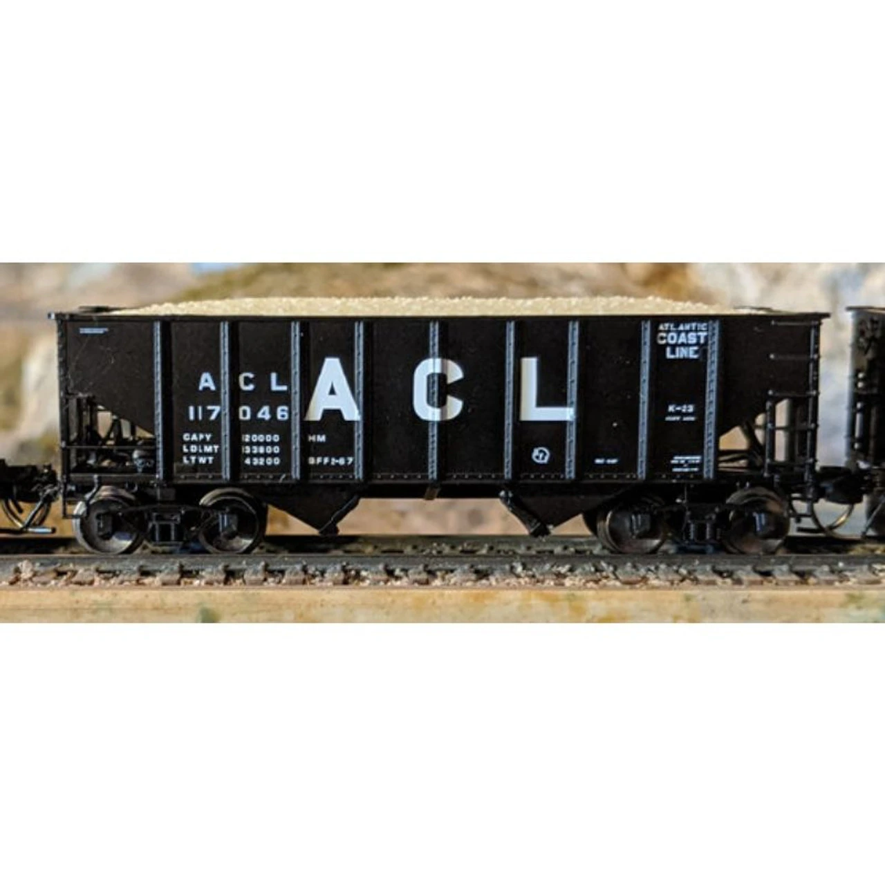 These ready-to-run cars feature die cast slope sheet-hopper bay-center sill assembly; injection molded plastic sides, ends, and hopper doors; fully molded brake tank, valve and air lines; body mounted brake hose detail; load; body mounted magnetically operating knuckle couplers; close coupling; and Fox Valley Models metal wheels.