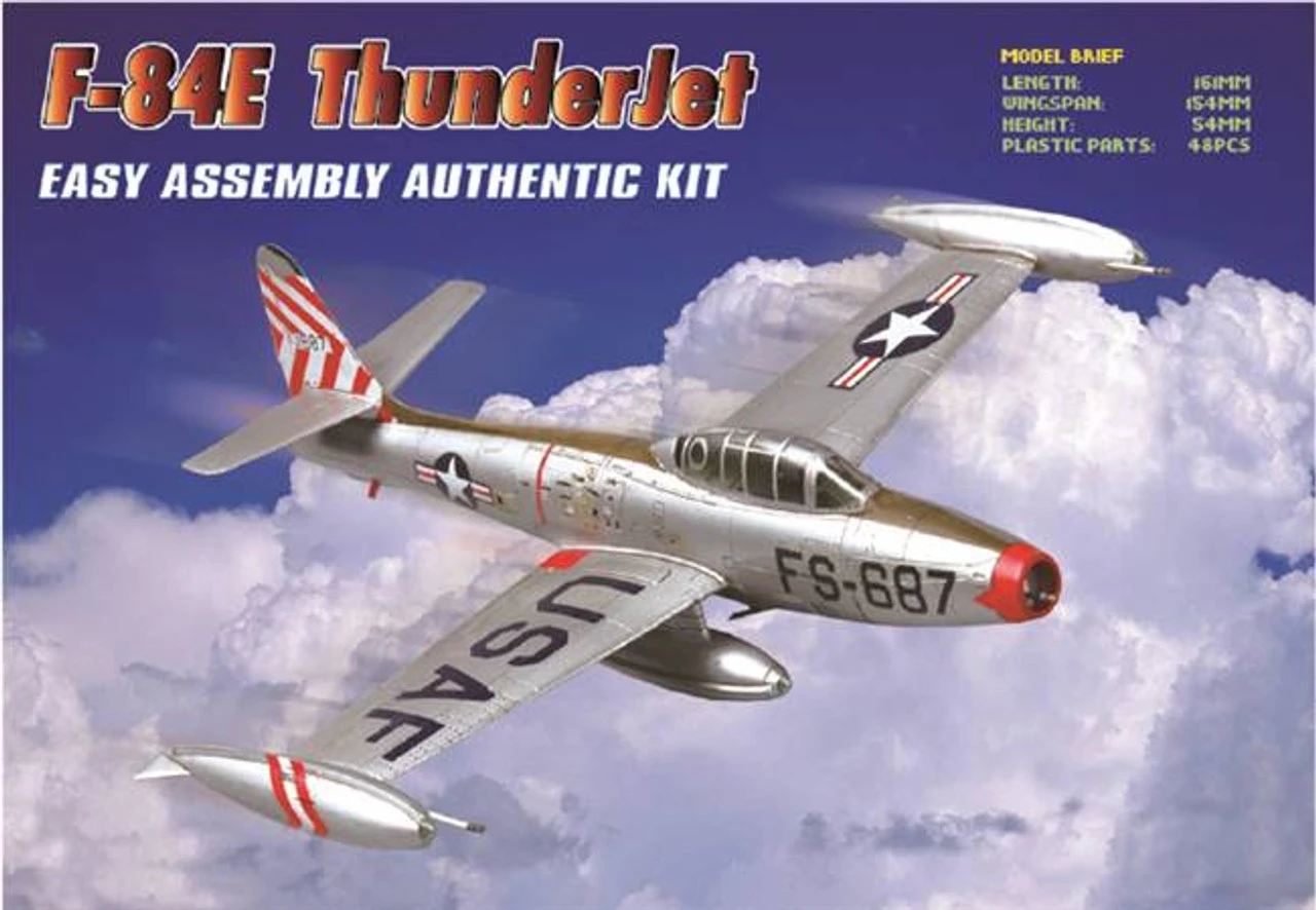 The first effective and fully-capable Thunderjet was the F-84E model which entered service in 1949. Â But the F-84E was withdrawn from USAF service in 1956, lingering with ANG units until 1959. Â The Republic Aviation Company F-84 Thunderjet was a turbojet fighter-bomber aircraft. Originating as a USAF proposal for a daytime fighter 1944. The F-84 first flew in 1946 and it entered service in 1947. Â When production of the F-84 was closed in 1953, about 4457 had been built, including 6 different versions.