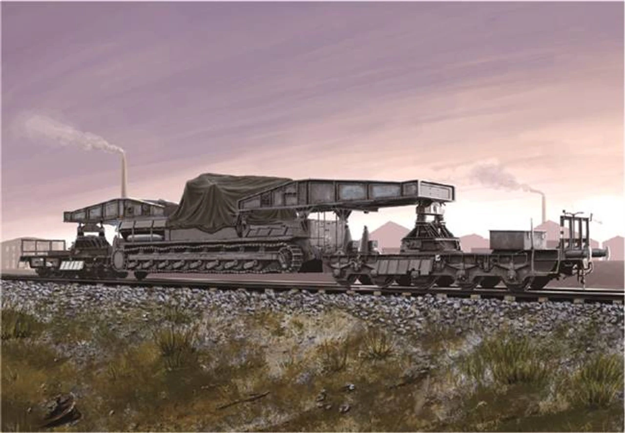 In October 1939, work began on designs for loading the Geraet 040 for rail transport. Due to the high weight and great length, it was necessary to transport this self-propelled gun supported by traversing pedestals mounted on two five-axle rail carriages. Supporting arms, attached to the Geraet 040, were lifted by massive hydraulic cylinders to suspend the self-propelled gun between the rail carriages.