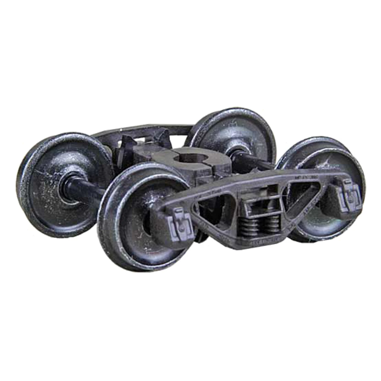 A.S.F.® Ride Control® 50 Ton Self Centering Trucks smooth back wheels “HGC” Two Piece Fully Equalized Trucks 1pr. Mounts with a #2 or 2-56 screw. The A. S. F.® A-3 Ride Control® 50-ton freight truck was introduced in the 1940’s and is one of the forerunners of modern freight trucks. Features embodied into this design include a longer spring travel, no spring planks and constant friction control using friction castings in the bolster to dampen excessive lateral roll of the car. These design features allowed for a higher train speed with less danger of derailment than previous designs. ASF® sold over 140,000 sets by 1949. This truck is excellent for modeling the transition era up to 1994 when friction bearings were no longer allowed in interchange service. Truck Features • Self Centering Action – Trucks self align themselves parallel with the car for easier placement on track. • Code 110 (.110) 33″ smooth back wheels • “HGC” Weighs nearly the same as Metal Trucks • Superior Rolling Ability. • Brake Pads • Accurate markings • Incredible detail True to prototype • Non-magnetic Metal Wheels • Highly Flexible Fully Equalized Trucks • Smooth tracking Free rolling Contoured Insulated Axles • RP-25 Free rolling wheels • Patent number 7,434,518 B2