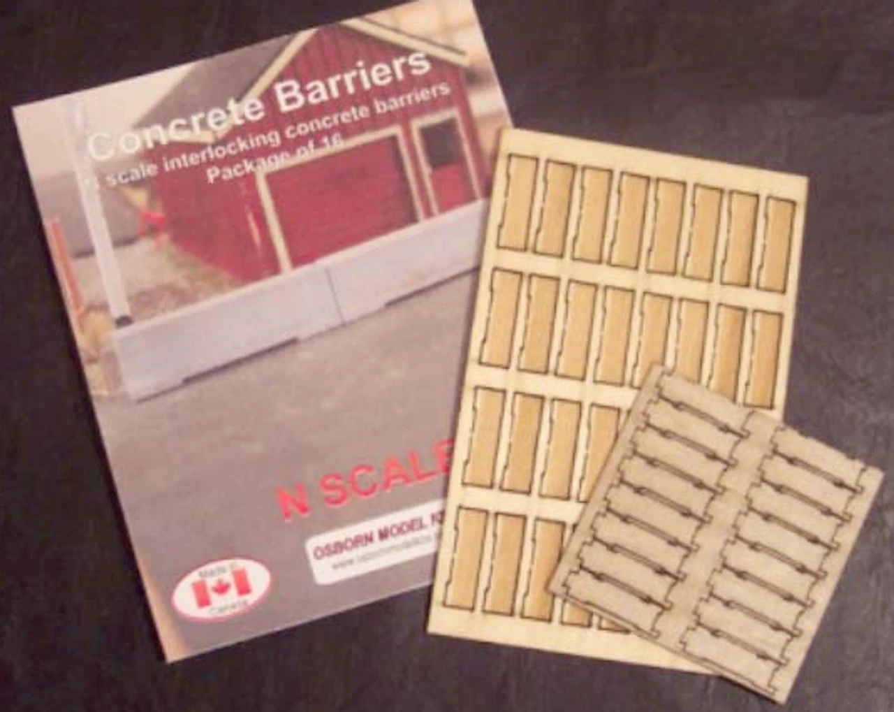 Osborn Models 3087 – Concrete Barriers – N Scale You want to add a touch of realism to your layout? Add some details. Concrete Barriers Package of 16 interlocking concrete barriers