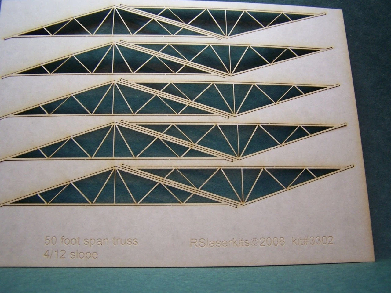 RslaserKits – RSL 3302 – 50′ span trusses – N Scale Craftsman Laser Cut Kits. Like all craftsman kits these are unfinished and will take som etime to build and finish. Kit contains 10 50 Foot Span TrussesWith a 4/12 Slope