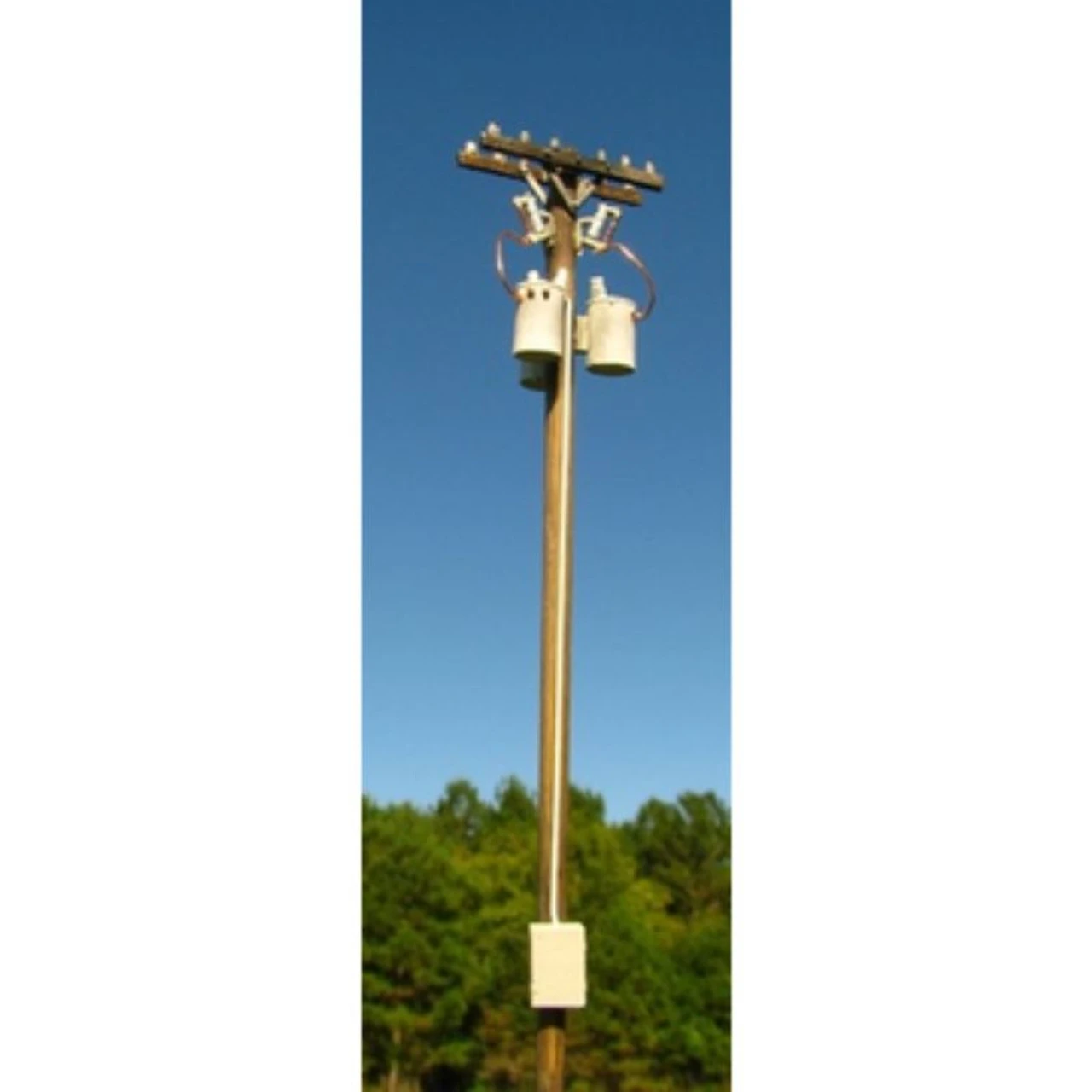 This is a life-like, “look like the real deal” little kit that includes everything you see in the picture, including the wires. The pole comes pre-painted and weathered to look like the real deal. Kit includes one pole, two cross arms, three transformer boxes, three drop-down fuses, one control box, two copper wires, and one longer brass wire (that can be painted) that connects the transformers to the control box. Showcase Miniatures HO Scale 40ft Transformer Bank