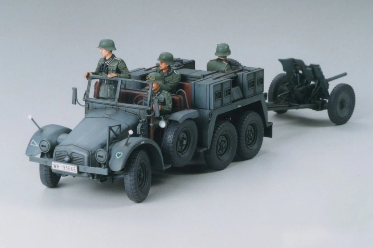 ★1/35 scale ★Overall length: 250mm ★Every characteristic of this truck such as the low-profile bonnet, the chassis, the ammunition boxes and the crew seats on the rear part, as well as the spare wheel for the anti-tank gun has been realistically reproduced. ★A 3.7cm Pak anti-tank gun and various accessories are part of the set. ★4 all-new figures and decals for 4 different markings are included.