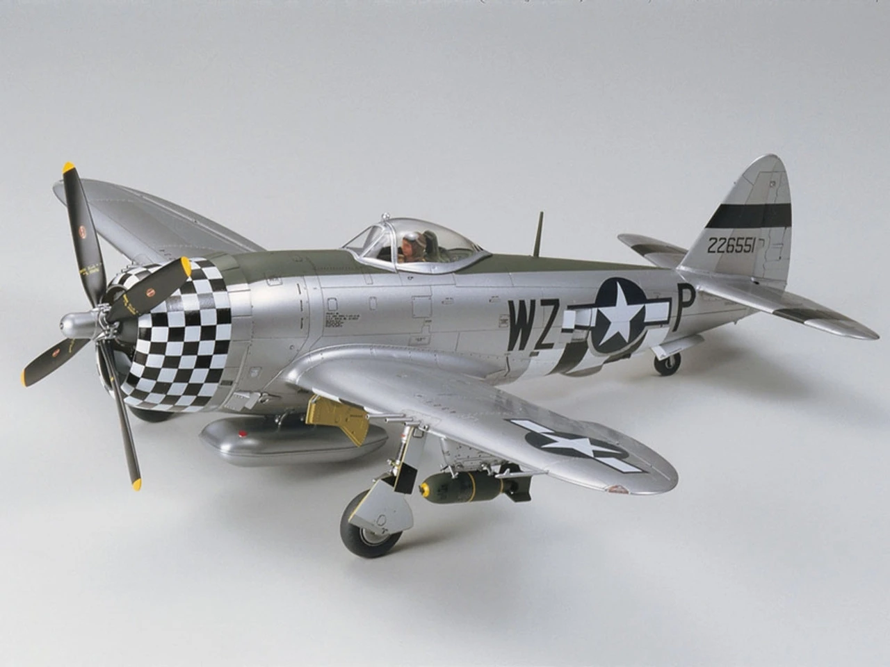 In May 1941, as the war raged in Europe, a single-engine fighter of more than 4 tons made its first flight. This fighter was the XP-47B, prototype of the Republic P-47 Thunderbolt of which a total of 15,683 units would be built. Thanks to war experience, this aircraft was equipped with a 2,000hp radial R-2800 engine, a supercharger and eight 12.7mm machine guns. The XP-47B was to reach 633km/h and in January 1942, just after the United States went to war, the production of P-47B began. It was followed by the P-47C that incorporated various improvements and, from April 1943, by the P-47D, the most built version. The P-47D was equipped with an R-2800-59 engine, which can develop up to 2,300hp with combat emergency water injection system engaged. The ducts that were passing on the sides and below the cockpit to connect the supercharger placed behind the pilot’s seat gave to this plane its massive aspect. Many sub-types of the P-47D, designated D-1 to D-40, were produced but the first versions were called “Razorback” because of their sharp edge dorsal fin. The D-25 sub-type, which was introduced around June 1944, was fitted with an electrically actuated bubble canopy in order to improve pilot visibility and increased capacity fuel tanks. This decision resulted in a completely remodeled plane shape. All subsequent sub-types were also fitted with the bubble canopy and became a characteristic feature of late production Thunderbolts. The P-47 “Bubbletop” proved to be an excellent, well-balanced fighter-bomber.