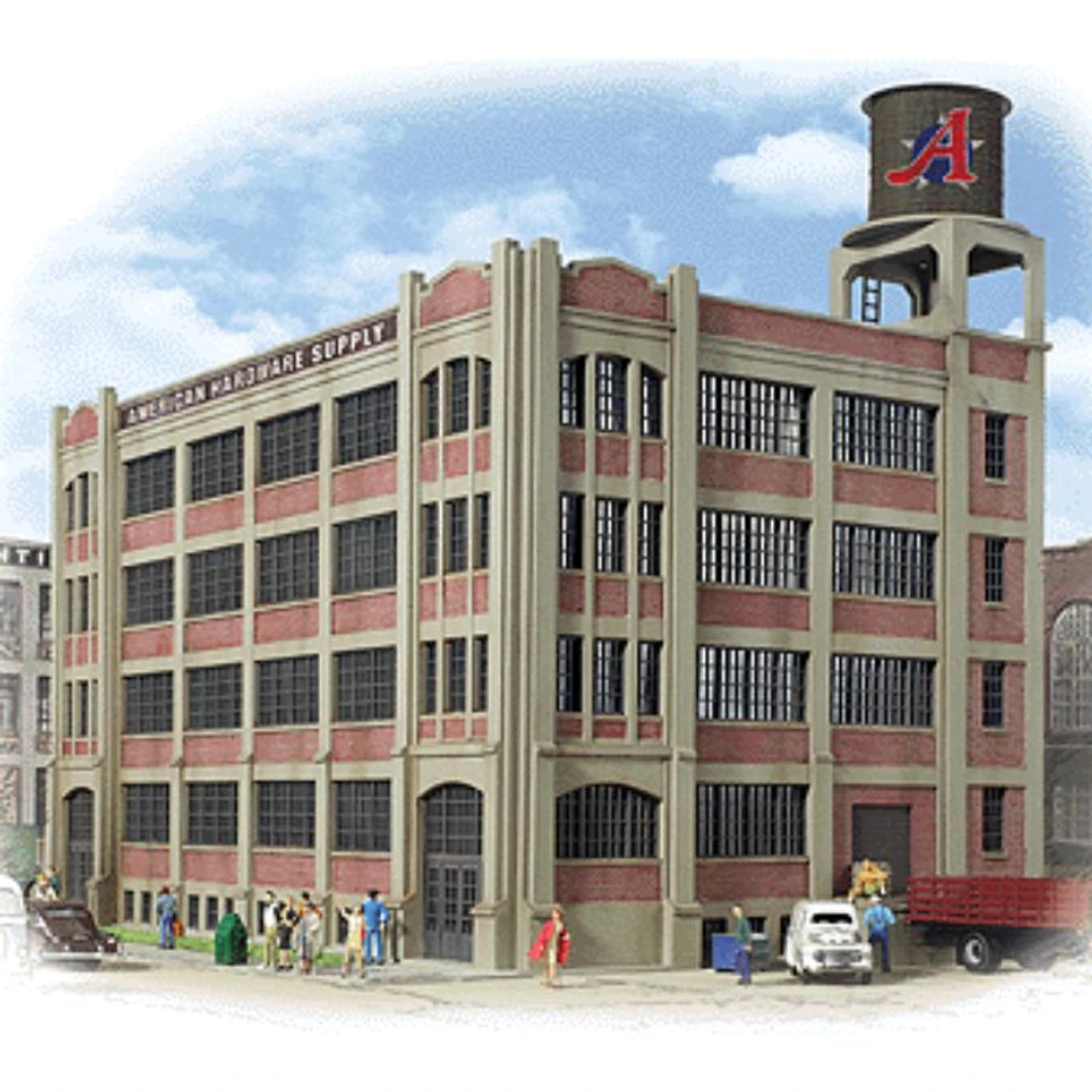 From the early years of the 20th century to the present, buildings like the Walthers Cornerstone American Hardware Supply have been a familiar part of big city skylines. Just about any manufacturing operation could be found here over the years. You’ll find this building is easy to modify for your needs too! Optional loading doors, windows or solid brick panels are provided for the ground floor so you can give your model a unique appearance. A modular design makes it easy to combine kits for a larger building, and there are many possibilities for kitbashing too. A concrete railroad loading dock and colorful signs for a variety of businesses round out this versatile structure. As shown American Hardware Supply measures: 8-1/4 x 5-3/4 x 6-7/8″ 20.9 x 14.6 x 17.4cm American Hardware Supply is just one of a wide variety of Cornerstone N Scale industrial buildings. Classic 1900s design Brick construction Fits steam or diesel-eras Molded in appropriate color Walthers N Scale American Hardware Supply