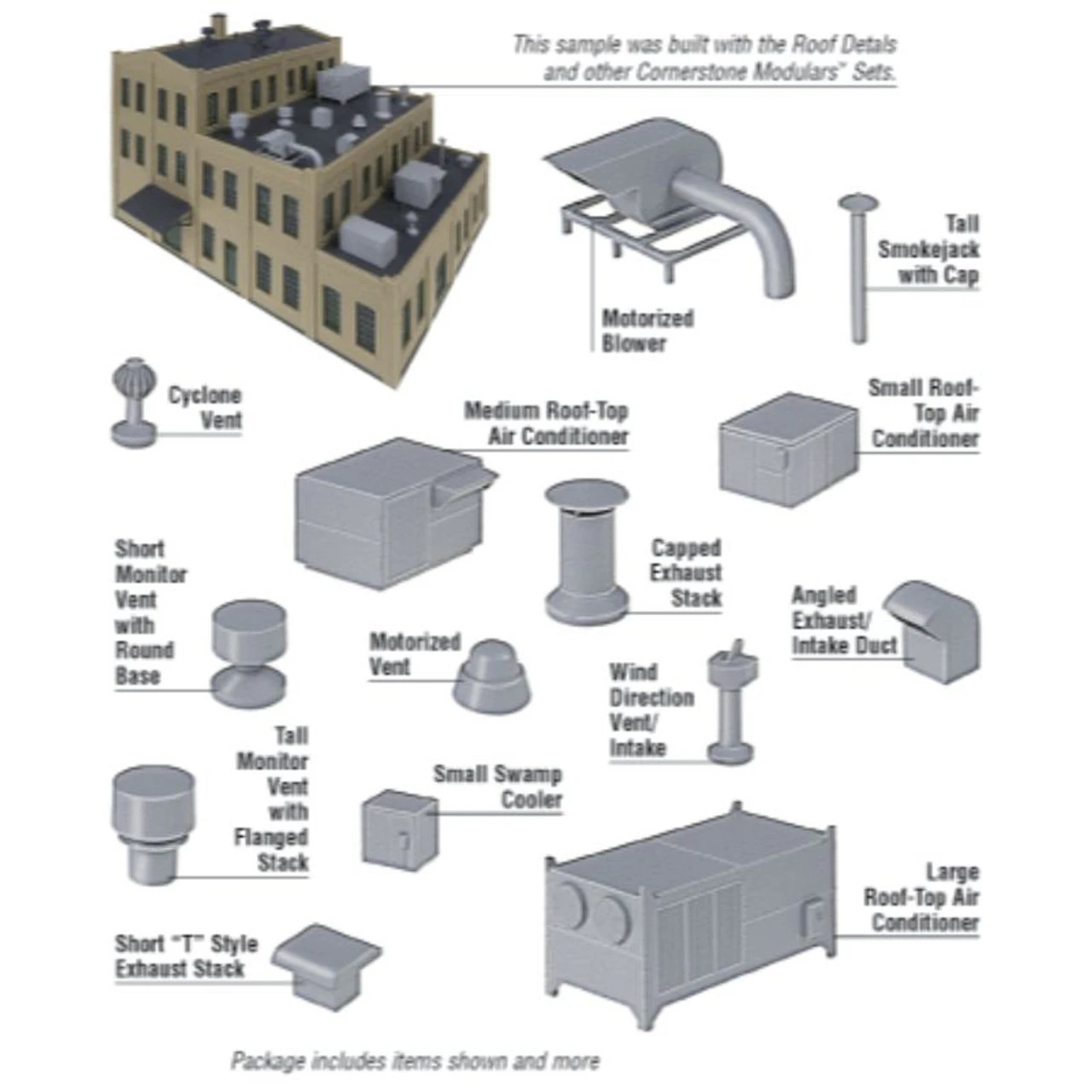 The Walthers Cornerstone HO Scale Roof Details set includes parts to add realism and interest to the most visible part of your structures. This set of building details includes parts to build the details in the list below. All parts are molded in gray. Use these Roof Details to add interest and detail to your Cornerstone HO Scale industrial buildings. 1 Large rooftop air conditioner 1 Medium rooftop air conditioner 1 Small rooftop air conditioner 2 Small swamp coolers 1 Motorized blower 4 Cyclone vents 4 Short monitor vents with round base 3 Tall monitor vents with flanged stack 2 Capped exhaust stacks 3 Motorized vents 3 Wind direction vent-intakes 3 Angled exhaust-Intake ducts 4 Short T-style exhaust stacks 5 tall smokejacks with caps Walthers HO Scale Roof Details Kit