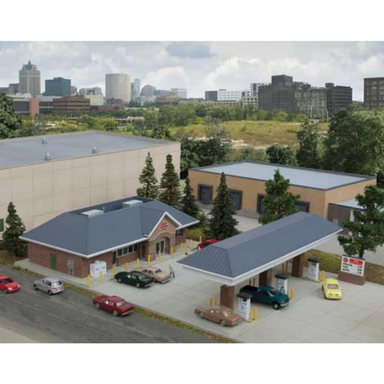 Turn an empty spot into a detailed business for your N Scale layout with the Cornerstone(R) Modern Gas Station Kit! Typical of today’s convenience store stations found in busy cities and rural areas, the kit includes a main building, car fueling island and four customizable parking lot sections (easily expanded with matching parts in the Modern Parking Lot kit (933-3886, sold separately). Other great features include: Full-color signs for Winner’s Circle Petro and Interstate Fuel and Oil Price sign, ice machine, rooftop air conditioners and vents, modern upright gas pumps safety & security posts & much more! Assembled models measure: Main Building: 5-3/4 x 3-5/8 x 1-3/4″ 14.6 x 9.2 x 4.4cm Auto Island: 6 x 1-7/8 x 2″ 15.2 x 4.7 x 5cm Parking Lot – each section: 5-3/4 x 2-7/8 x .050″ 14.6 x 7.3 x 0.127cm Walthers N Scale Modern Gas Station Kit Road Name: Road Number: Photo may not show actual road number . Please see description for actual road number
