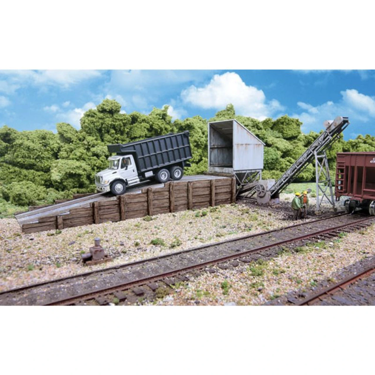 The Walthers Cornerstone Truck Dump kit is based on authentic facility used for loading all kinds of materials from dump trucks into hoppers or gondolas. This kit includes a timber-supported gravel truck ramp, corrugated-metal dump house and hopper, a positionable hopper loading conveyor that can be arranged left, right or center, and a car puller. Use the Truck Dump to add a shipping facility to any siding on your 1970s and later layout. The Truck Dump is just one of a wide variety of Cornerstone industrial buildings. Easy-to-build plastic kit Gravel truck ramp with timber walls Metal dump shed and hopper Looks at home from the 1970s to the present Perfect for use with gondolas and hoppers Positionable conveyor and car puller Molded in two appropriate colors Conveyor & Shed: 5-3/16 x 1-5/8 x 1-3/32″ 13.1 x 4.1 x 2.77cm Loading Ramp: 7 x 2 x 1-1/8″ 17.7 x 5 x 2.8cm Car Puller: 1/2 x 9/32 x 1/2″ 1.2 x 0.7 x 1.2cm
