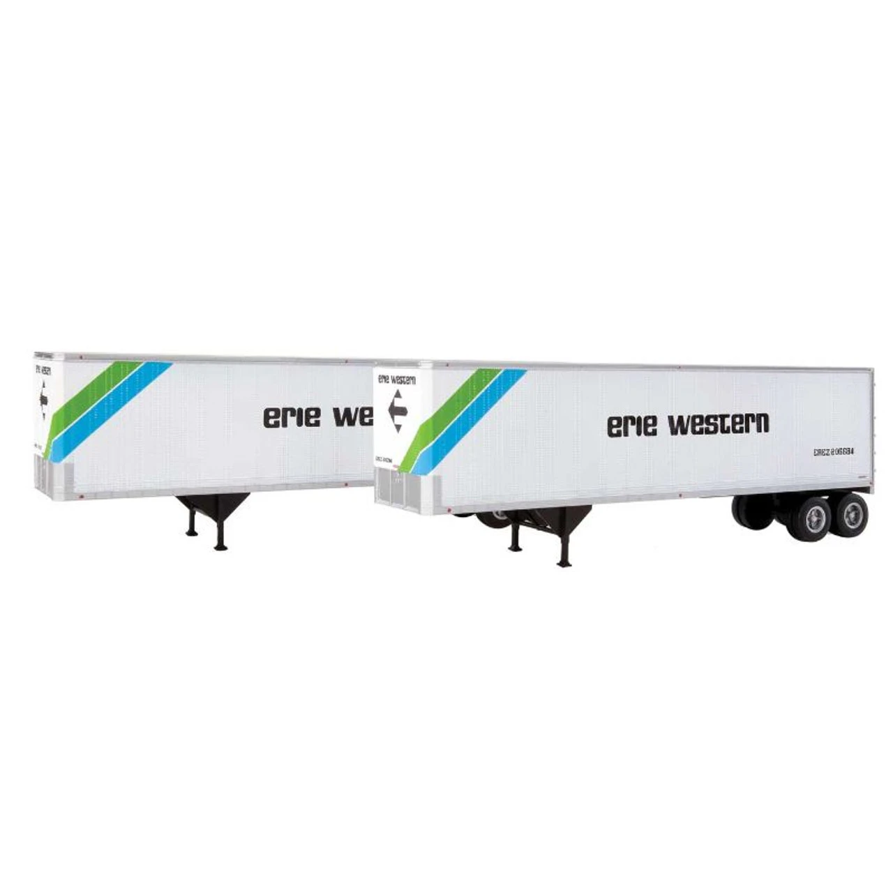 Walthers SceneMaster 40′ 1970s-style Trailmobile Dry Van 2-Packs are a great addition to vintage trailer-on-flatcar (TOFC) service and period HO highways from the 1970s to the 1980s. Fully assembled and ready for service, each includes two matching trailers featuring: Standard length trailers seen all across North America in the 1970s and 1980s Must-have for modeling period piggyback service Used by dozens of railroads and trucking companies Instant detail for vintage highways, loading docks and terminals Highly detailed body with scale rivet details, four door latch bars, and landing gear in up and down positions Walthers HO Scale 40′ Trailmobile Trailer 2-Pack Road Name: Erie Western Road Number: Photo may not show actual road number . Please see description for actual road number
