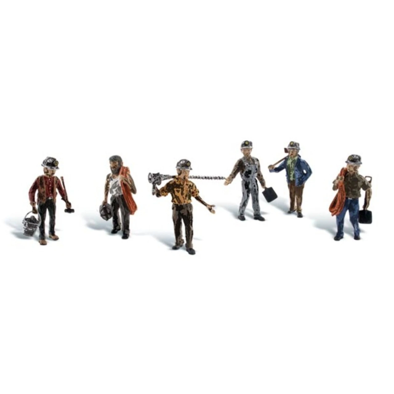 Miners toting all the equipment they need for their shift deep below the Earth’s surface Set contains 6 pieces. Colors may vary from actual product. Complete your scene and bring it to life with affordable works of art in HO scale. Sculpted in fine detail and hand-painted, they add color, humor and interest to any layout. Scenic Accents figures have a natural charm and a realistic appearance that steal the show! Economy packages also available in HO scale. Attach with Scenic Accents Glue and position with Gentle Grips®.