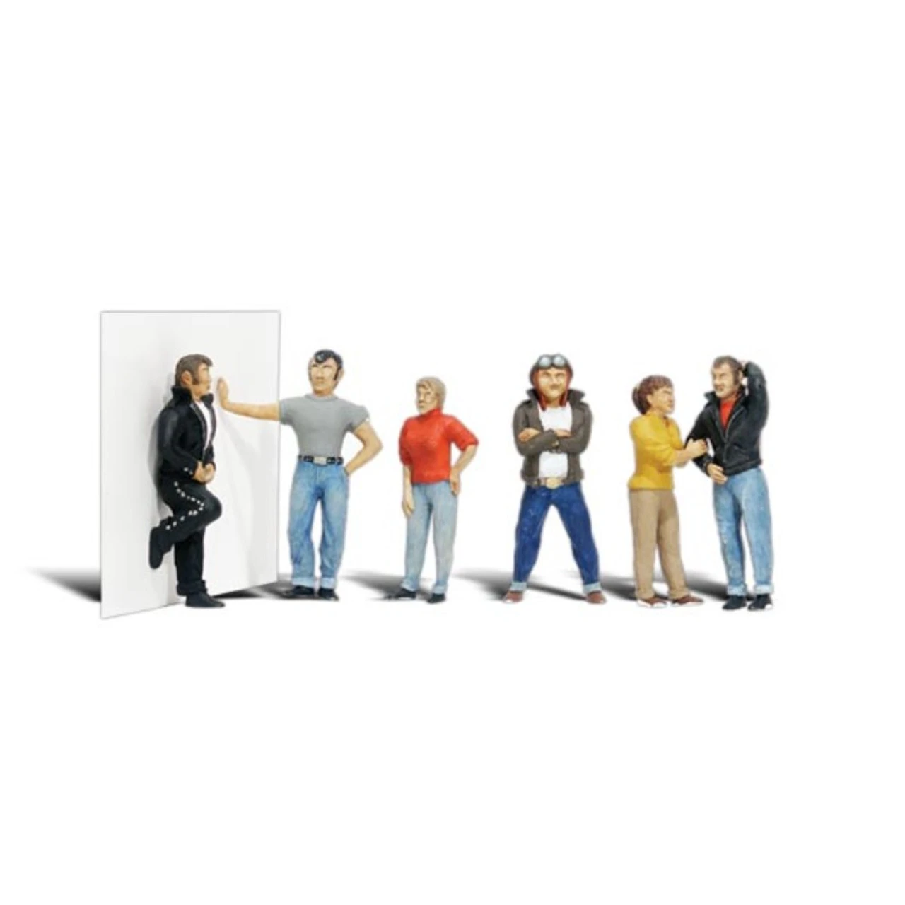 A cool couple stands together, arms entwined, while the man fixes his hair. Another couple stands together: his arms are crossed and her hand rests on her hip. One man leans with his hand on the wall. Another man adjusts his leather jacket. Set contains 6 pieces. Colors may vary from actual product.